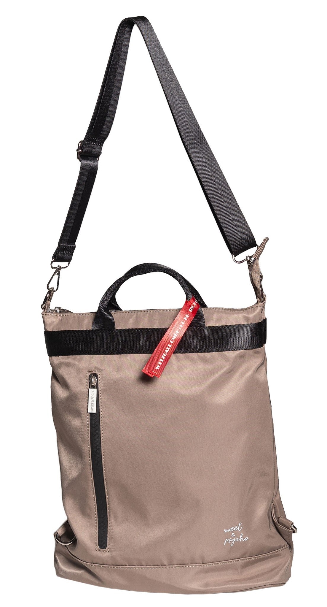 Unser SWEET & PSYCHO „TROIS“ Rucksack überzeugt mit einem wasserabweisenden, leichten Nylon-Gewebe. Abnehmbar durch One-Klick-Karabiner: Die Schultergurte mit einstellbarer Länge lassen sich abnehmen. Zusätzlich gibt es noch einen Schulterriemen. Kurze Griffe…damit wird unser Rucksack zur Tasche. Die Sweet & Psycho Tasche können Sie ganz bequem über der Schulter tragen.