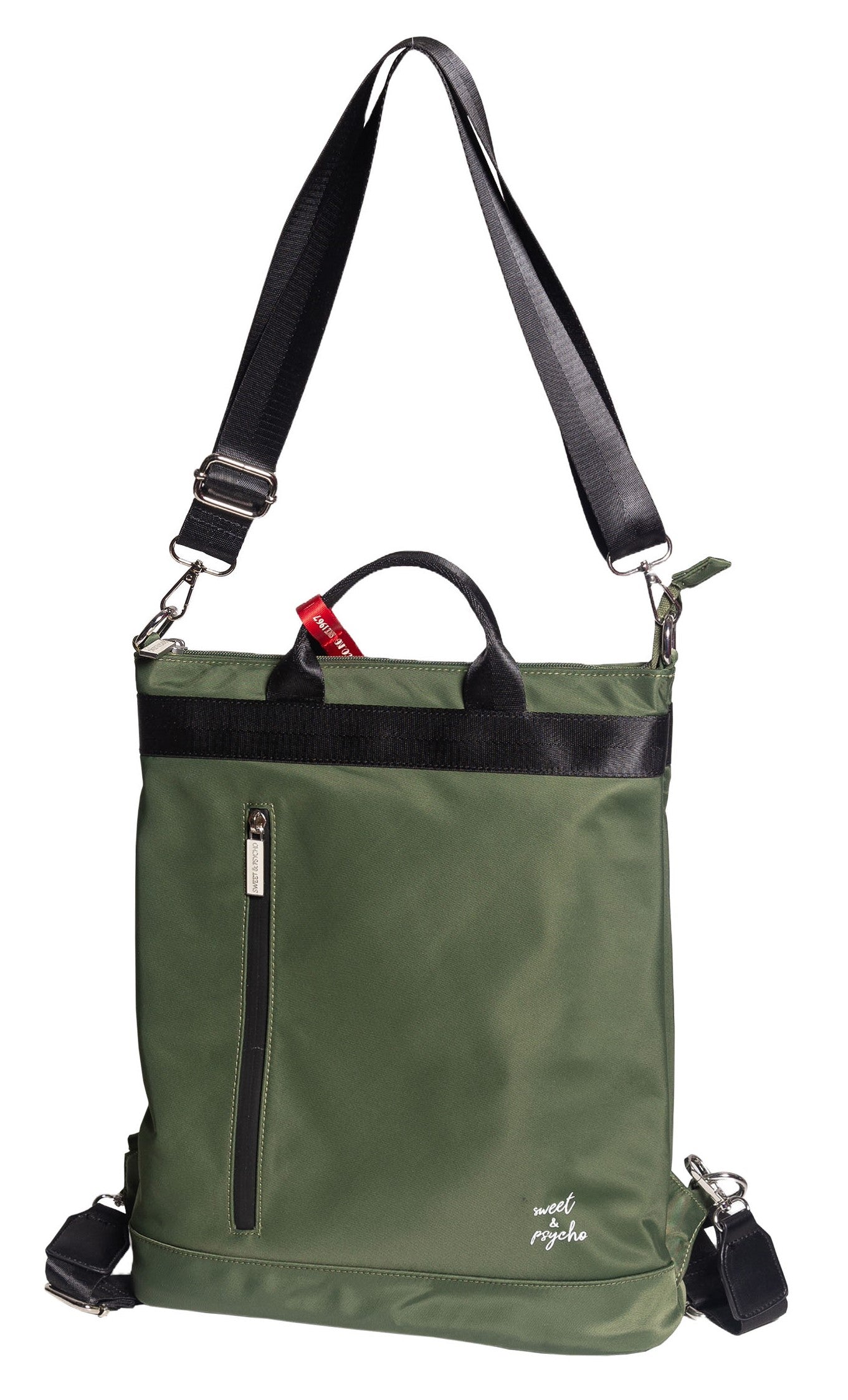 Unser SWEET & PSYCHO „TROIS“ Rucksack überzeugt mit einem wasserabweisenden, leichten Nylon-Gewebe. Abnehmbar durch One-Klick-Karabiner: Die Schultergurte mit einstellbarer Länge lassen sich abnehmen. Zusätzlich gibt es noch einen Schulterriemen. Kurze Griffe…damit wird unser Rucksack zur Tasche. Die Sweet & Psycho Tasche können Sie ganz bequem über der Schulter tragen.